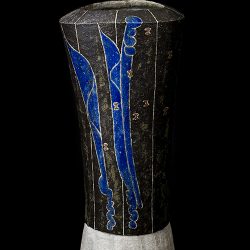 It is eclipsed shape that gradually widen from the bottom toward the top. He covered it with black glaze, but remained only the lines left uncolored aiming to show the clay. You can see brown glazed butterflies flying around the blue thin feather-like raiment.