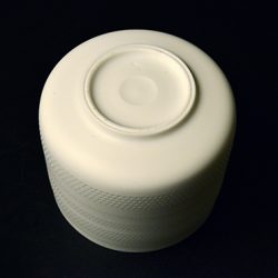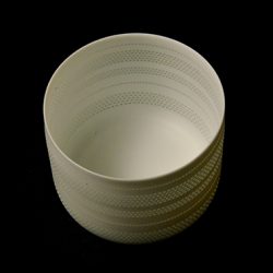 「光器」で注目を浴びる新里先生の作品は、透光性のある模様を映し出す中国の 蛍手の技法を独特にアレンジして、小さな点描から光のエレガントな様子を浮き 上がらせている。整然なフォルムと土から沸き上がる轆轤のスピード感で、凛と した知的なシャープさを醸し出し、その静かでシンプルな佇まいが見る人の心に 語りかけている。