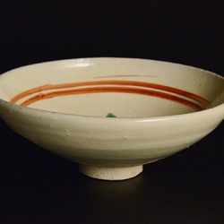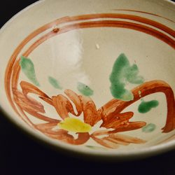 高台に見られる情緒ある轆轤目、中心をややずらした透明釉の掛け方、どれをとっても宗麿先生の美意識を感じることが出来、色鮮やかで美しい碗である。