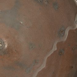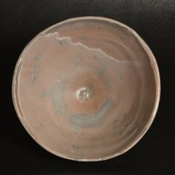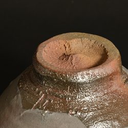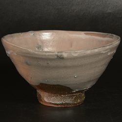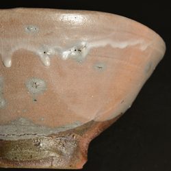 緋色に焼き上げられた土肌を、覆いかぶさるように半透明の乳白釉が掛けられた本作は、幾度か釉薬を付け足したのだろうか、胴回りと見込のそれぞれに、異なる表情の釉垂れが残っている。 また、表面にできた複数の石ハゼは、作為的に施されたかのように、茶碗の魅力的な風景の一部となっている。