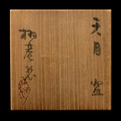 Munemaro Ishiguro created so many beautiful works of Syako-han (feather-like pattern), Tenmoku with Kaki glaze, and brushed black slip design. This art work has Tenmoku glaze with his characteristic iron color.