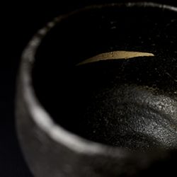 His Seto-guro has warm and gentle feeling in his original rounded cylindrical shape. The tea bowl has full of tasteful expression such as where glossy, opaque black, or mixed texture, willful unglazed area inside, and so on.