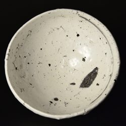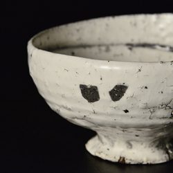 黒っぽく荒い素地にはゆったりとリズム良く轆轤目が入り、その上にはたっぷりと白化粧が施されている。