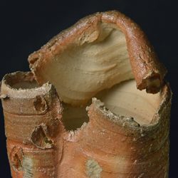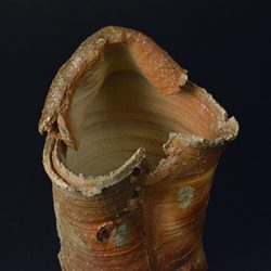 陶缶という見事なネーミング、リアルになりすぎない造形、裂け目の荒々しさがありながらも大らかで温かみを感じ、高台には切り糸の跡目が付き年輪のようにも見え、作品全体が時間の経過を見事に表現しているようである。