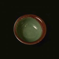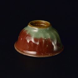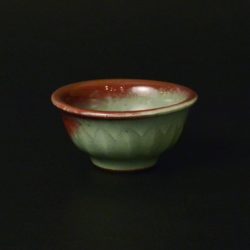 青瓷の青緑と辰砂の紅色の落ち着いたコントラストに惹かれ、手に取ると厚く施釉された下に浮かびあがる彫りの美しさにも気がつく。口の部分がすこし外にそれていて酔った手からも逃げないと思われ、見込みを覗くとうっとり落ち着いた気持ちになる。