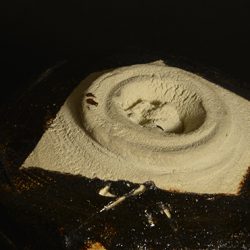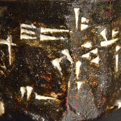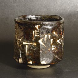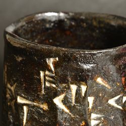 筒型のフォルムにしっとりとした黒織部の表面には、掻き落して表現された楔形文字が描かれている。何千年もの昔に使われていた文字だが、不思議とモダンな文様にも見えてくる。