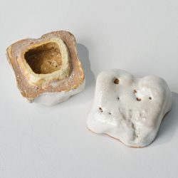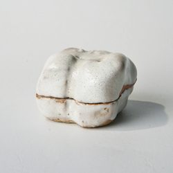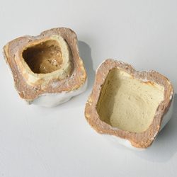 The attached area of lid and mouth, and inside the container are not glazed so that you can see the soft clay, which he achieved to express the heartwarming spring snow.