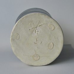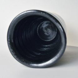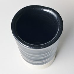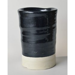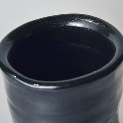 白い素地を下部に残して鉄分を多く含んだ釉薬が厚くかかり色の対比が際立っている。小山先生ならではのたっぷりとした土使いによる造形で、口に向かうにつれ空間が開き、大きく残る轆轤目により光と影がうまれ様々な油滴の表情を見ることができる。月明かりに照らされた揺れる水面のようで神秘的。