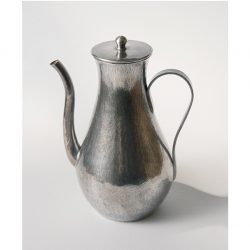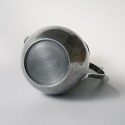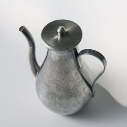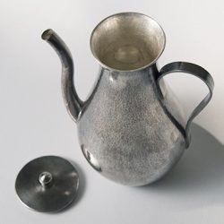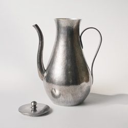 手間を惜しまずに丁寧な工程を経て、たたいて造形した痕が秩序を形成し、金属でありながらも冷たさを感じさせず、自然な曲線の立ち姿の美しい注瓶です。控えめながらも凛とした存在感を発し、熱いお湯を注いだり冷たいお水を入れたり盆手前でお使いいただくなど、様々な場面で重宝しそうな一品です。