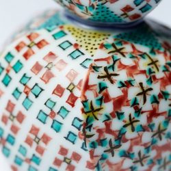 He created a series of four petal pattern and twisted tokkuri, but no one is same. The real creativity that needs. The bright color use is enjoyable.