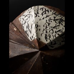 本作品は、折紙を丸く切り取りランダムに扇形に折って作られたような不思議な形。