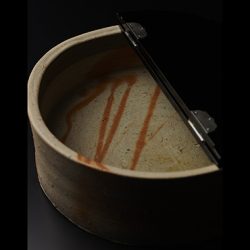 This is a thirty-centimeter-wide full water container. The clay shows the distinctive of firing effects of climbing kiln. You can see elegant wheeling marks and wide scarlet Hidasuki marks and seven lines in the container. This form conditioned as sharp and simple as possible makes us appreciate using the item, once we know more about the passion of the artist. The bottom, beaten marks here and there, attracts us a lot. It has a holding lacquer lid