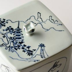 こちらの水指は、正面に二頭、裏側に一頭、馬が描かれています。豊藏先生は、ご自身が午年生まれであったことから、馬の絵をモチーフとして多く取り上げております。画家を目指されていたという豊藏先生の筆致には躍動感があり、共蓋の山水画も軽やかな陽射しが感じられそうな明るさがあります。