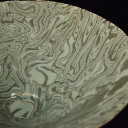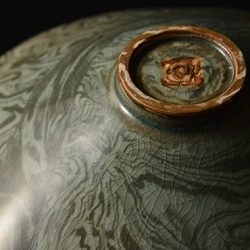 弁柄色と象牙色の土が見事に練り上げられ釉がかかると、優しい若葉色と黄枯茶(きがらちゃ)色に変わる。